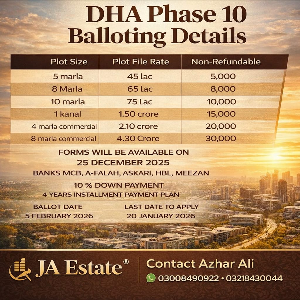The DHA Phase 10 installment plan 2025 offers residential and commercial plot files on a 4-year easy payment plan with 10% down payment, making it one of the most affordable new DHA Lahore launches. The plan includes 5 Marla, 8 Marla, 10 Marla, 1 Kanal residential, and commercial plot files, followed by official DHA balloting.