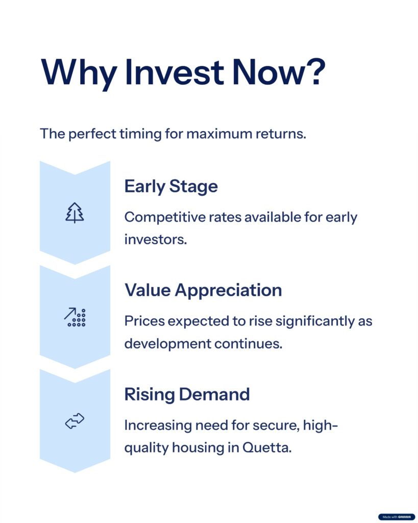 With ongoing infrastructure development and the rising demand for secure, high-quality housing in Quetta, this is a limited-time window to secure plots at competitive rates.