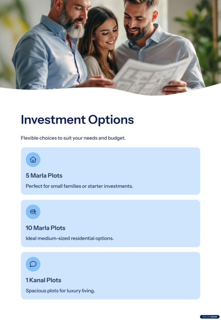Residential plots in multiple sizes (5 Marla, 10 Marla, 1 Kanal).