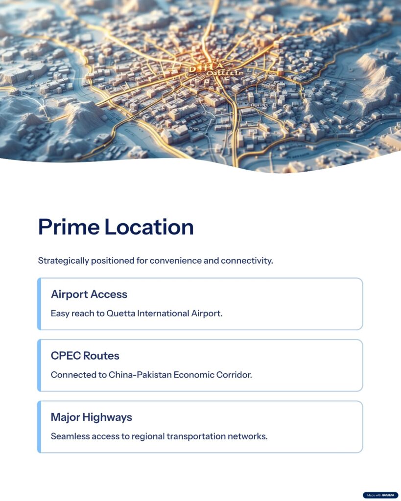 Prime Location: Strategically situated with easy access to the Quetta International Airport, CPEC routes, and major highways.